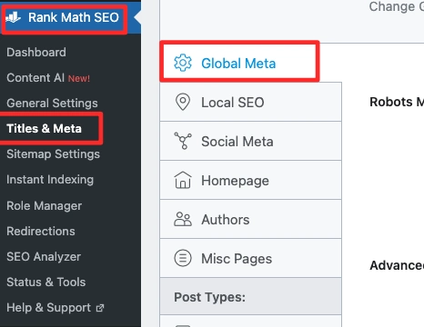1. Dari halaman admin WordPress, navigasi ke menu Rank Math → Title & Meta.
